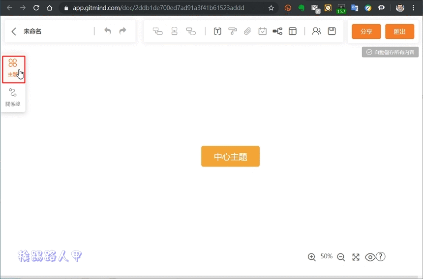 預設的風格其實蠻好看的,但每個人有自己喜歡的風格,「GitMind」也提供了許多主題風格,左邊有個主題鈕,點選即可拉出一個捲動視窗,這裡提供蠻多的主題風格可選擇。