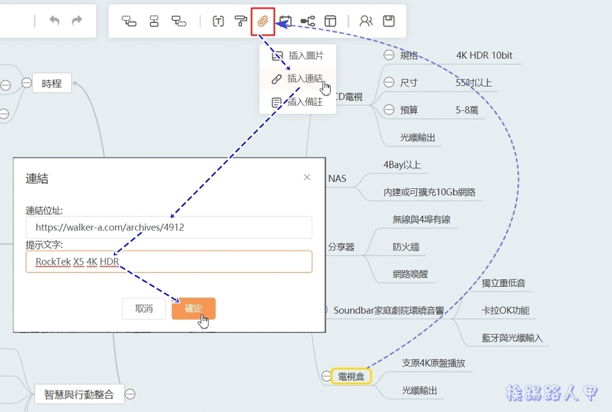 「GitMind」除了基本的文字心智圖外,每一個節點也能插入圖片、連結與註解,例如下圖是在「電視盒」節點插入一篇能播放4K影片的產品開箱文連結,插入後其節點名稱後方會出現一個連結的小圖示,若將滑鼠指標移至連結小圖示上會出現連結網址,點選擇會直接開啟網頁,讓你的腦圖的關聯資訊更完整。