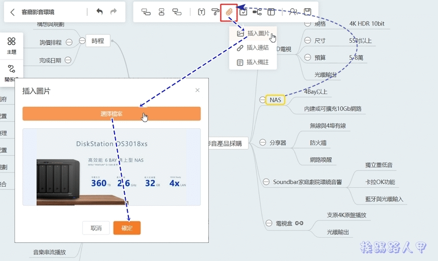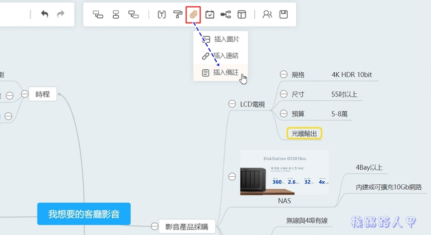 插入超連結沒什麼,節點插入圖片能讓腦圖更加圖文並茂,下動態圖可以看到插入圖檔後,直接在節點上方顯示縮小的預覽圖,直接明白NAS的選擇是什麼?個人覺得很實用,但若有複雜節點的新智圖,圖檔的大小要控制得宜,且重點節點插入即可,不然會讓整個腦圖不易看出架構的佈局。想要看原圖的樣貌,點選縮小的預覽圖兩下即可彈出原圖。