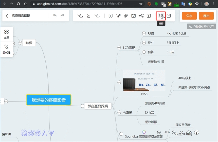 進入心智圖編輯畫面上,點選上方工具列的〔協作〕鈕,此時會在右測滑出操作成員名單視窗,按下「邀請成員協作」即可獲得邀請的連結與邀請碼,提供給合作夥伴來連結登入。