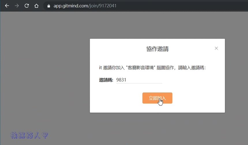 將畫面轉移至被邀請人的電腦上,被邀請人也必須有GitMind的帳號(沒有會導入註冊會面)。被邀請人輸入邀請的連結與邀請碼即可看到心智圖的畫面,不過不能編輯,此時要點選右上的〔申請編輯〕按鈕能取得編輯權,之前描述過,不管邀請多少人,同時間只能一個人擁有編輯權。